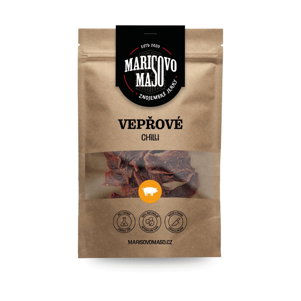 Sušené vepřové maso, balené dřevěné párátko, absorpční sáček kyslíku.